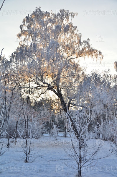 Деревья покрытые инеем в первых лучах солнца