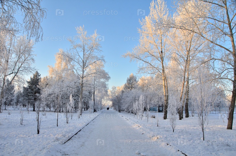 Деревья покрытые инеем в первых лучах солнца