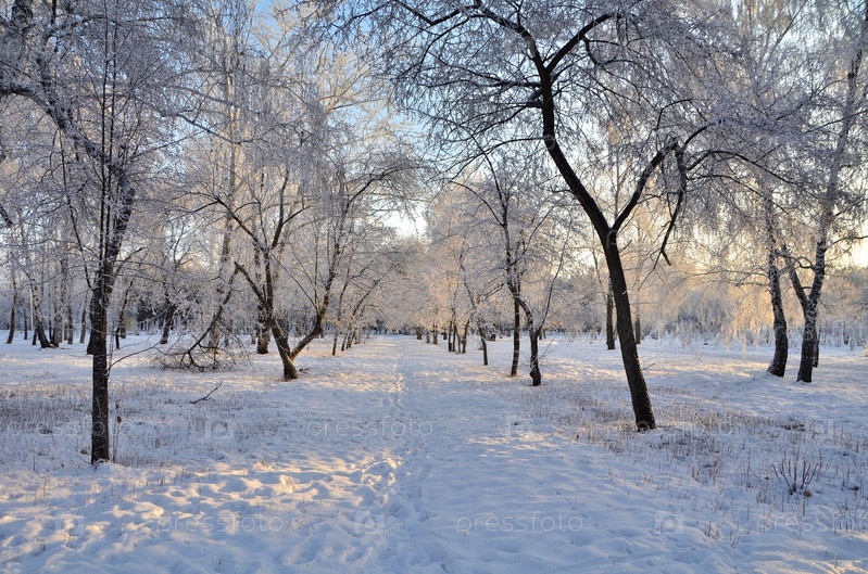 Деревья покрытые инеем в первых лучах солнца