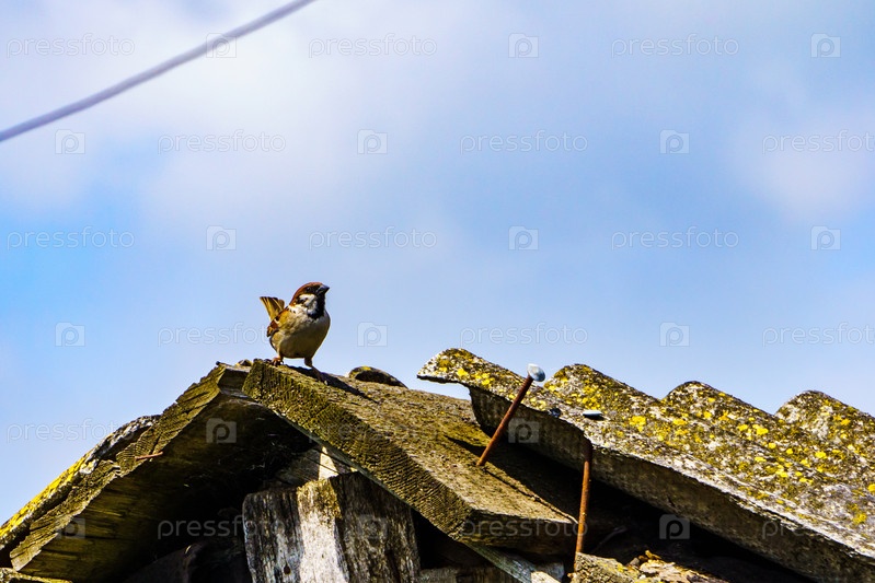 Сельский пейзаж. Воробей на крыше. Поселок Красная Заря. Орловская область