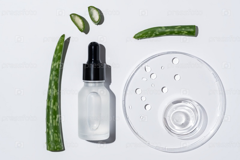 Абстрактная косметическая лаборатория. кусочки алоэ вера и свежий гель на стекле Петри, флакон-капельница с экстрактом алоэ