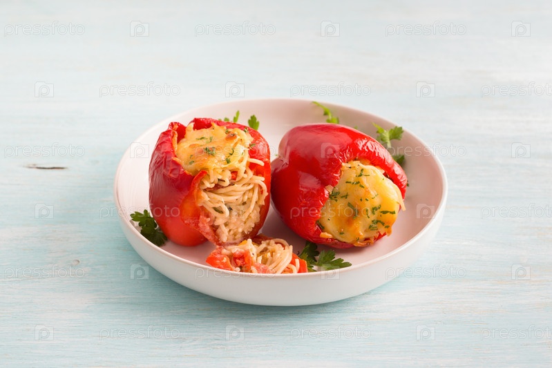 Красный перец, фаршированный макаронами, овощами, сыром и зеленью в форме для выпечки на голубом фоне. Вкусная домашняя еда