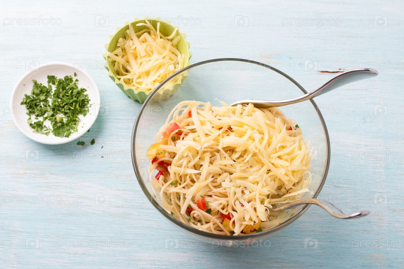 Стеклянная миска с летней пастой: спагетти, помидоры, красный перец, петрушка, специи и тертый сыр на голубом фоне. этап приготовления