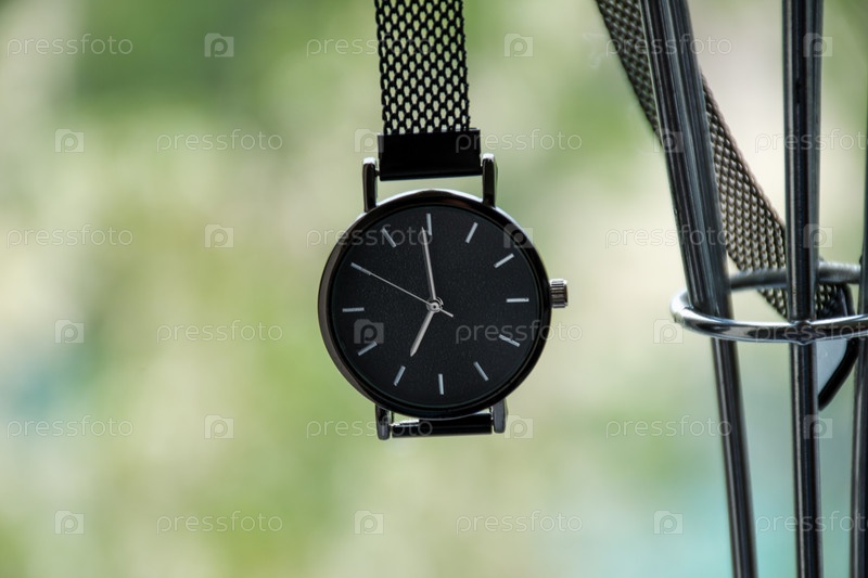 Женские наручные часы черного цвета. Крупный план. На размытом фоне