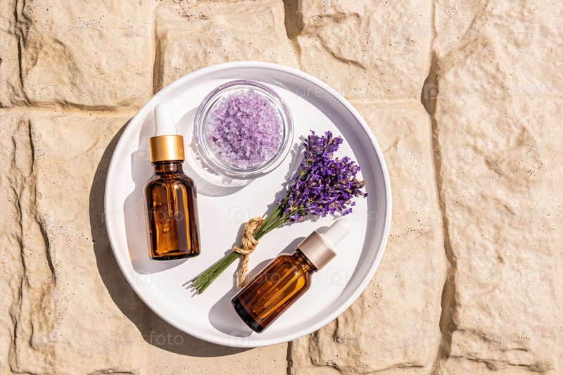 Две косметические бутылочки-капельницы с натуральным продуктом для ухода за собой на основе лавандового масла на белом подносе с букетом лаванды. Спа-процедуры