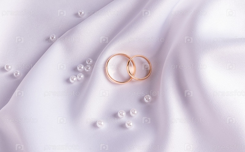 Шикарный свадебный фон с обручальными золотыми кольцами, лежащими на волне белой атласной ткани и жемчуга. Концепция свадьбы. открытка. вид сверху