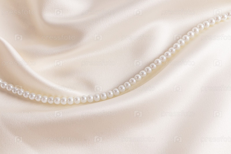 Шикарный атлас кремового цвета с ниткой жемчужных бусин среди мягких волн ткани. Свадебный праздник фон для дизайна. Место для копирования