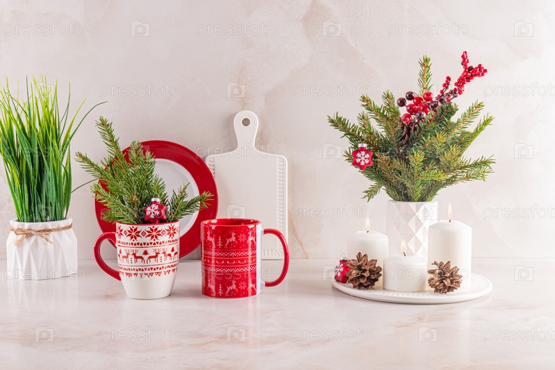 Рождественские яркие кружки с орнаментом, еловыми ветками, шишками, украшениями на кухонной мраморной столешнице в современном кухонном интерьере. Передний план