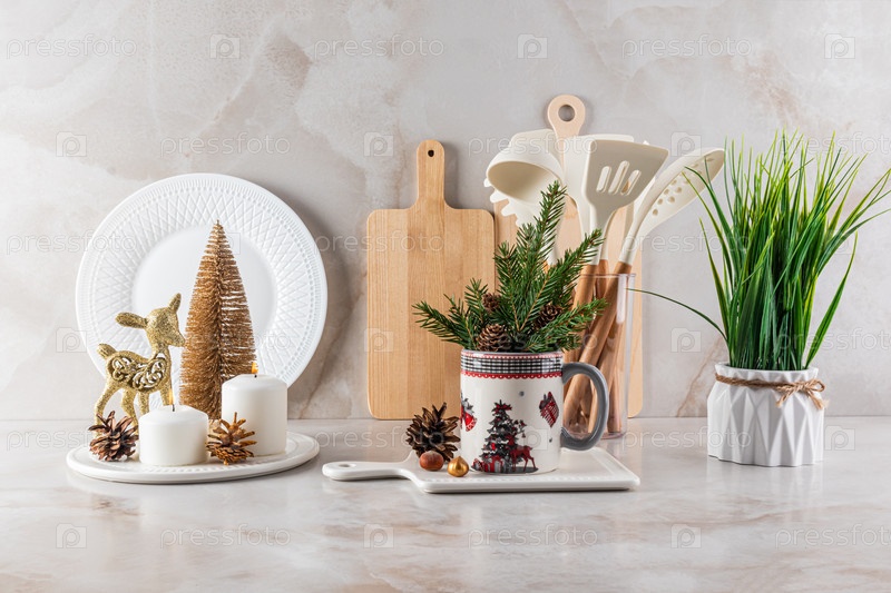 Красивый рождественский фон кухонной столешницы, украшенный к Новому году и Рождеству в золотых тонах. свечи, еловые ветки. золотые безделушки