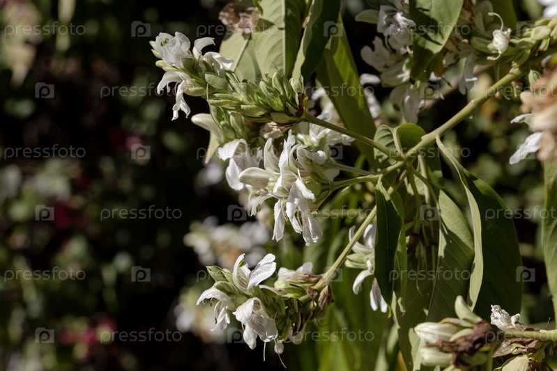 Растение (Justicia adhatoda) с белыми соцветиями в крупном плане