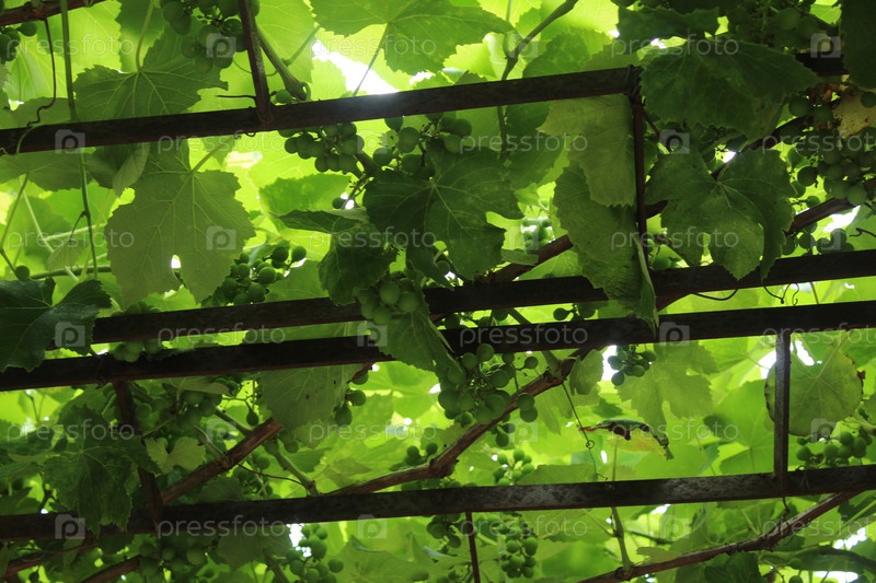 Ветка винограда в винограднике. Выращивание винограда летом. Вертикальная фотография