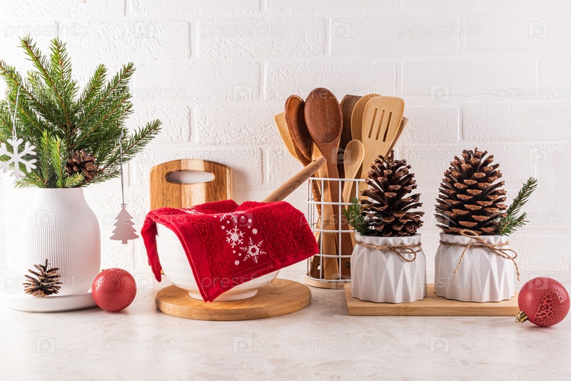 Кухонная столешница, украшенная к Новому году и Рождеству, с посудой для приготовления праздничного ужина. ветви. горшки с кедровыми шишками