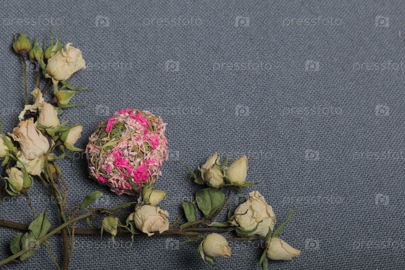 Сушеные бежевые розы. На фоне серой ткани грубая текстура. Рядом декоративный шар из сухой травы разных цветов