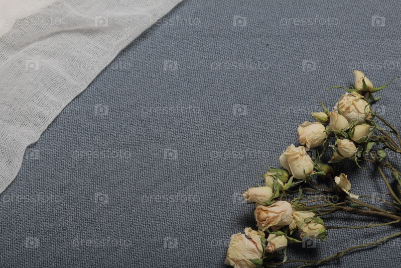 Сушеные бежевые розы. На фоне серой ткани грубая текстура. Рядом белая ткань