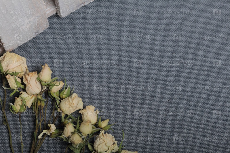 Сушеные бежевые розы. На фоне серой ткани грубая текстура. Рядом стоит деревянный ящик, выкрашенный в белый цвет
