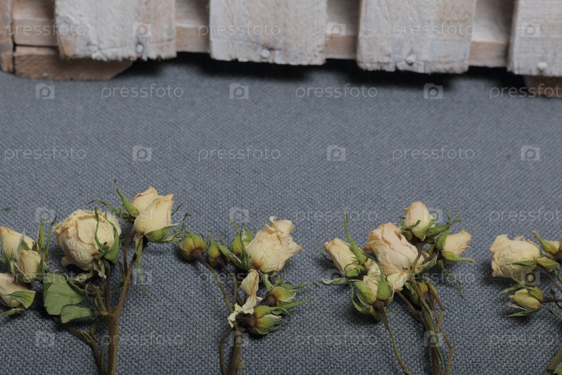 Сушеные бежевые розы. На фоне серой ткани грубая текстура. Рядом стоит деревянный ящик, выкрашенный в белый цвет