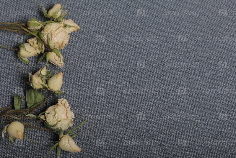 Сушеные бежевые розы. На фоне серой ткани грубая текстура. Вдоль левой стороны кадра