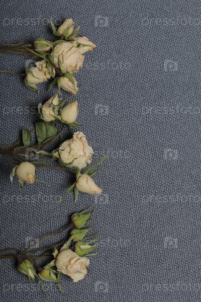 Сушеные бежевые розы. На фоне серой ткани грубая текстура. Вдоль левой стороны кадра