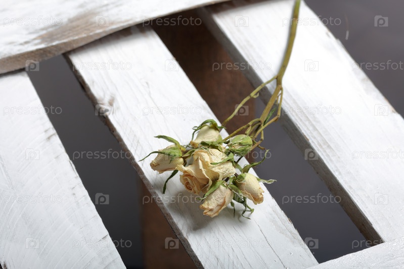 Сушеные бежевые розы. Они лежат на деревянных досках, выкрашенных белой краской