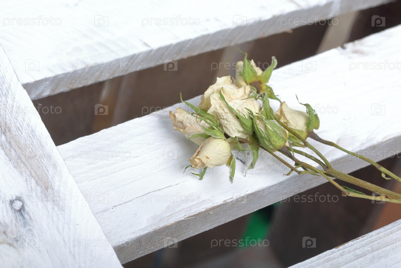Сушеные бежевые розы. Они лежат на деревянных досках, выкрашенных белой краской