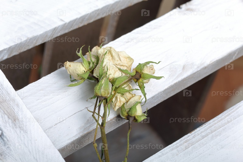 Сушеные бежевые розы. Они лежат на деревянных досках, выкрашенных белой краской