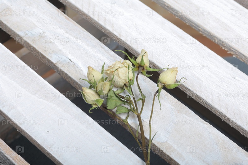 Сушеные бежевые розы. Они лежат на деревянных досках, выкрашенных белой краской