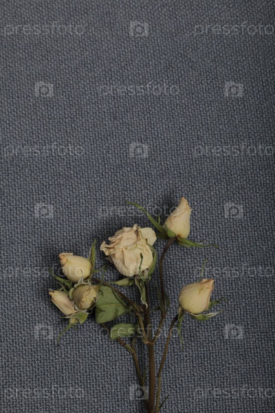 Сушеные бежевые розы. На фоне серой ткани грубая текстура