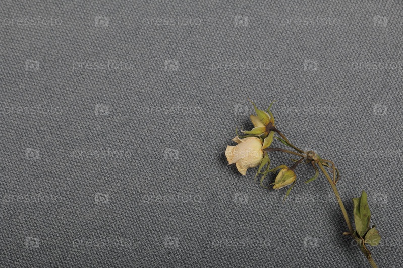Сушеные бежевые розы. На фоне серой ткани грубая текстура