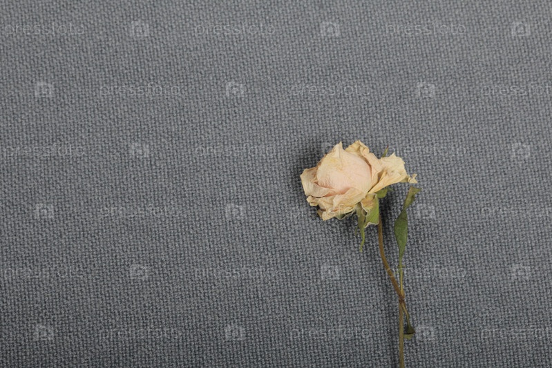 Сушеная бежевая роза. На фоне серой ткани грубая текстура
