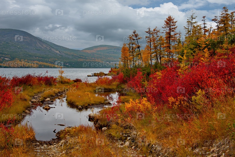 Россия. Дальний Восток, Магаданская область. Удивительная своими красками осень на берегу озера Макси