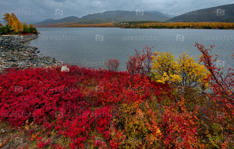 Россия. Дальний Восток, Магаданская область. Удивительная своими красками осень на берегу озера Макси