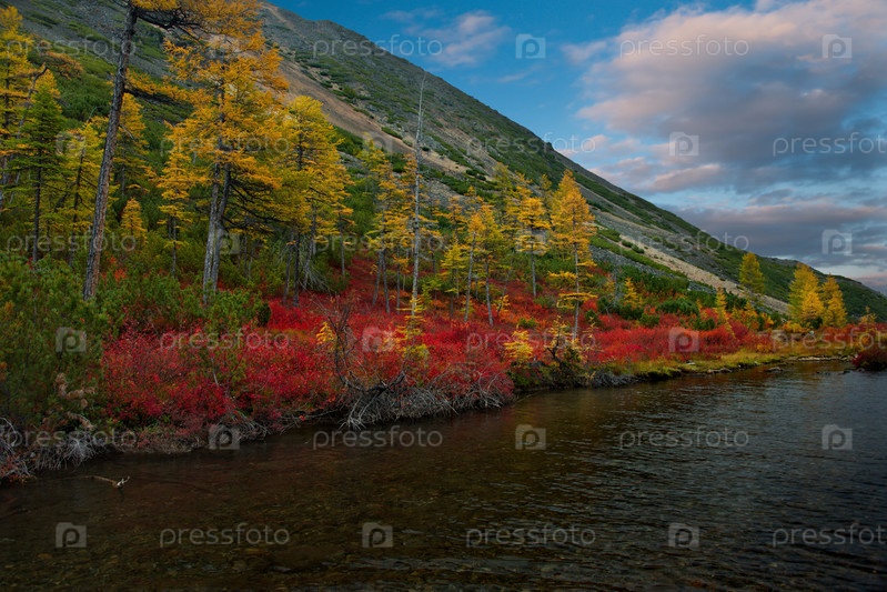 Россия. Дальний Восток, Магаданская область. Удивительная своими красками осень на берегу озера Макси