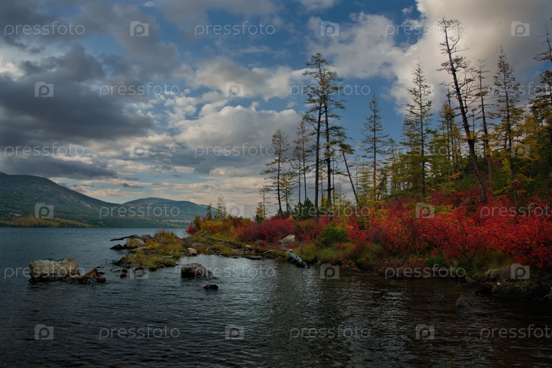 Россия. Дальний Восток, Магаданская область. Удивительная своими красками осень на берегу озера Макси