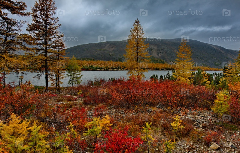 Россия. Дальний Восток, Магаданская область. Удивительная своими красками осень на берегу озера Макси