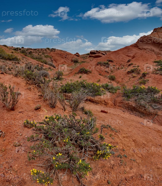 Северный Кыргызстан. Живописные виды на знаменитый каньон Сказка, глинистые горные вершины которого окрашены в яркие цвета от желтого до красно-коричневого