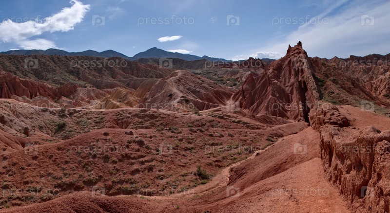 Северный Кыргызстан. Живописные виды на знаменитый каньон Сказка, глинистые горные вершины которого окрашены в яркие цвета от желтого до красно-коричневого