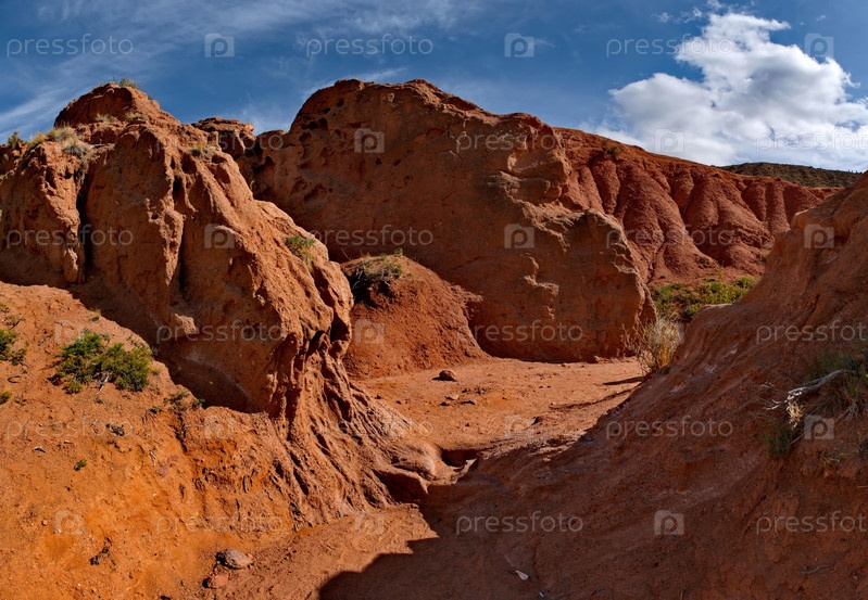 Северный Кыргызстан. Живописные виды на знаменитый каньон Сказка, глинистые горные вершины которого окрашены в яркие цвета от желтого до красно-коричневого