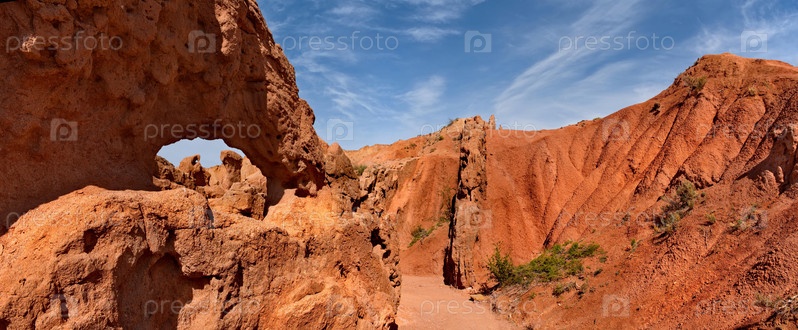 Северный Кыргызстан. Живописные виды на знаменитый каньон Сказка, глинистые горные вершины которого окрашены в яркие цвета от желтого до красно-коричневого