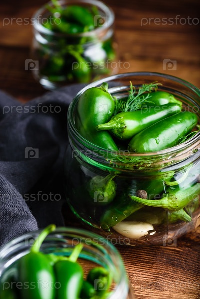 Перцы халапеньо в стеклянных банках для консервирования с укропом и чесноком на деревянном столе