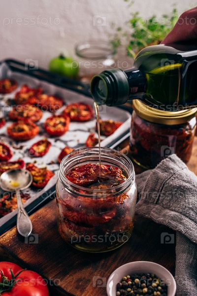 Томатное варенье с тимьяном и чесноком в оливковом масле в стеклянной банке