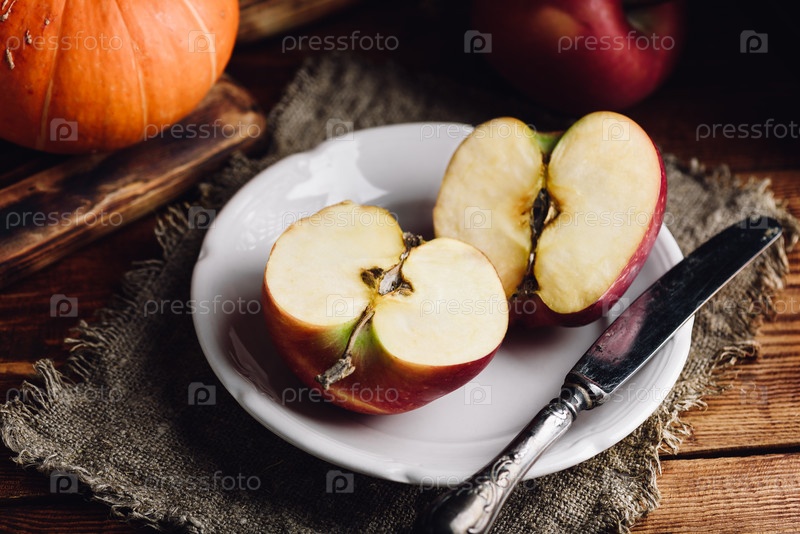 Две половинки красного яблока на белой тарелке со старинным ножом в деревенской обстановке