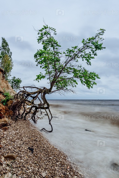 Дерево на скалистом берегу в бурный день
