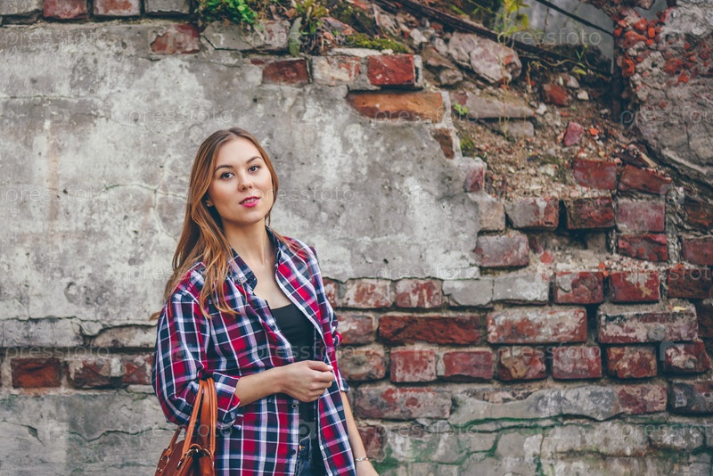 Красивая девушка стоит у кирпичной стены