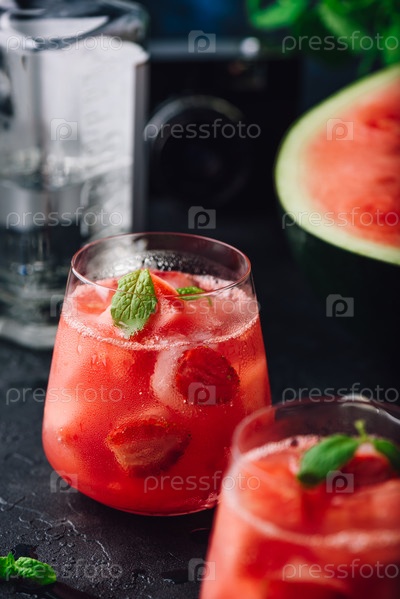 Стаканы арбузно-клубничного коктейля с мятным гарниром на темном бетонном фоне