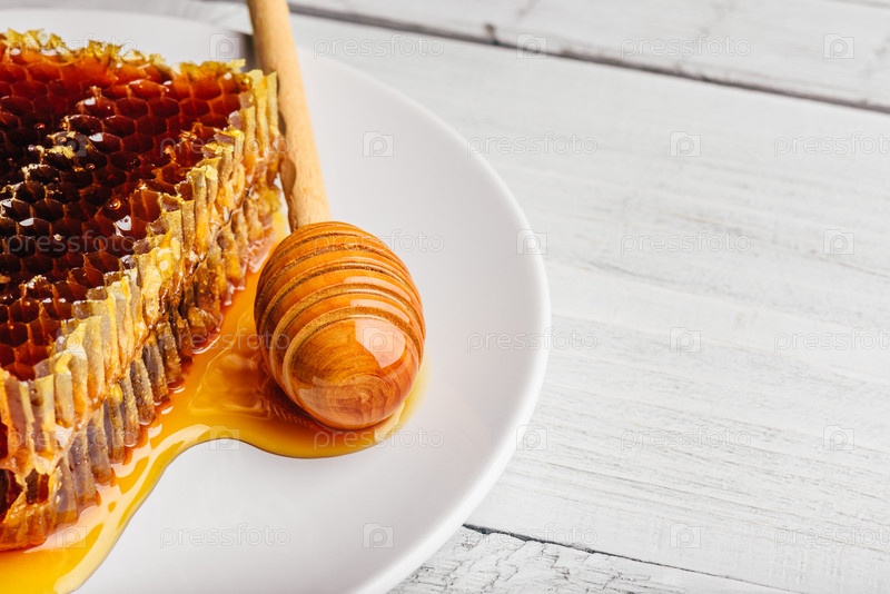 Соты на тарелке с медовым ковшом