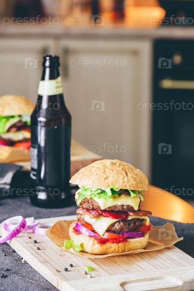Чизбургер с бутылкой пива и некоторыми ингредиентами