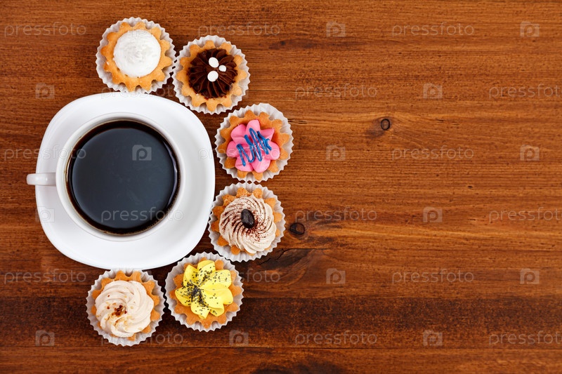 Крупным планом маленькая чашка кофе с разноцветными кексами