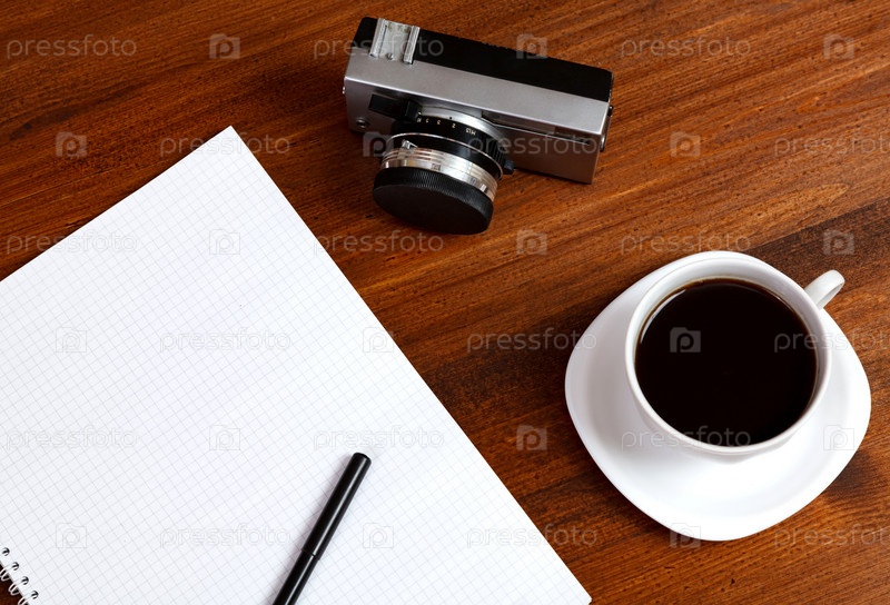Ретро-пленочный фотоаппарат, чашка кофе и блокнот с карандашом на коричневом столе. Вид сверху