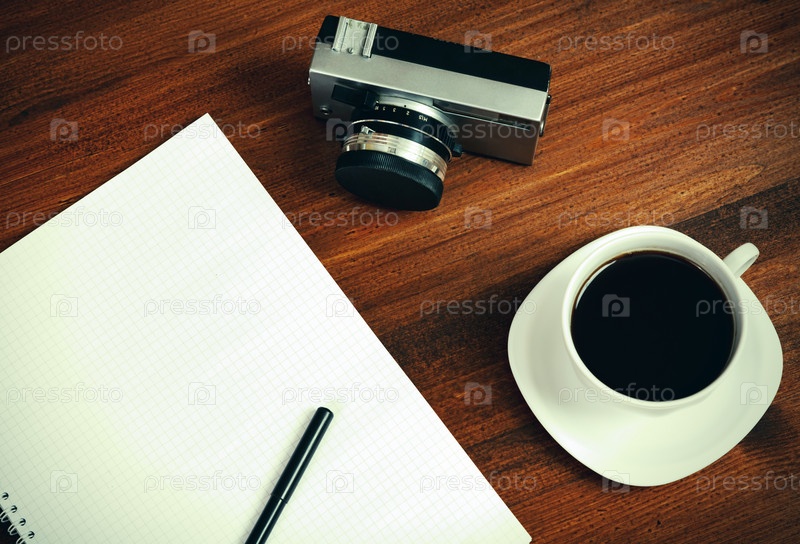 Ретро-пленочный фотоаппарат, чашка кофе и блокнот с карандашом на коричневом столе. Вид сверху