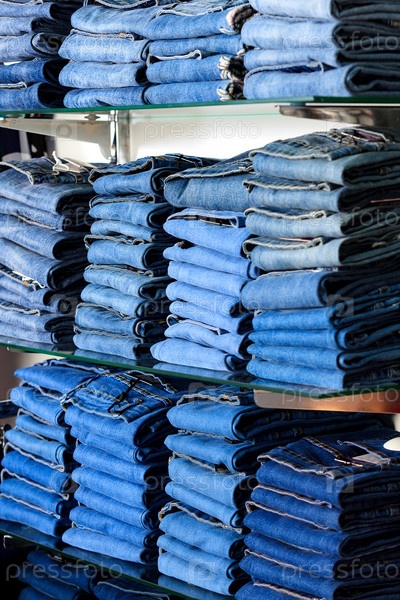 Крупным планом стопка сложенных джинсов в магазине модной одежды